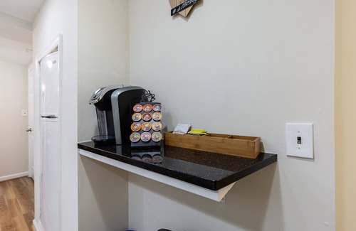 Enjoy a full coffee bar which includes a Keurig 2.0 with delicious coffee pods, tea, hot chocolate, creamer packets, and sugar. The kitchen is also fully equipped with new dishes and utensils, as well as red copper pots and pans. We have a sturdy counter height dining table that is perfect for gathering as a family.