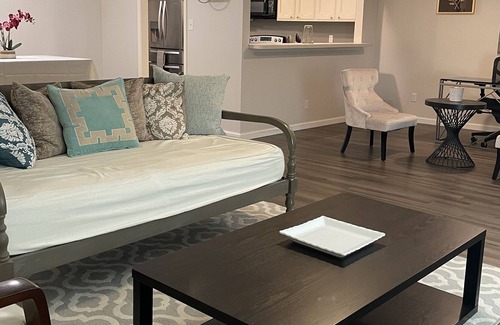 Cozy, quiet and quaint courtyard style home for a bargain, 1610 square feet. Lots of privacy in a mature neighborhood with mature trees. Backyard includes patio furniture. Close commute to the freeway, close to many amenities including dining, shopping, entertainment and hospitals/healthcare. Garage is available for use, fireplace is decorative only. Washer and dryer located in the garage.