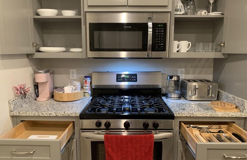 The kitchen is fully equipped with everything you'll need from baking to cooking a meal for 10 and a fully stocked coffee bar for all your coffee needs. The kitchen showcases stainless steel appliances, granite countertops, and a gas cooktop. The living room comfortably seats 8-10 guests, making it the perfect gathering spot. Also, you'll find a heated full-body massage chair, offering the perfect respite after a day of exploring or activities. The living room is equipped with a 50" wall-mounted TV for entertainment. A half bathroom is conveniently located in the common area for added convenience.