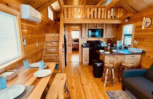 - Loft: Cozy loft (3’6” height) with queen mattress, bedding, and fan — perfect for extra guests or kids.