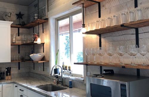 Open concept living with dream kitchen. Large kitchen with gorgeous quartzite island and countertops, commercial grade appliances. Beautiful bathroom with three sinks. Every room has its own custom design, from shiplap walls to rustic barn wood accents.