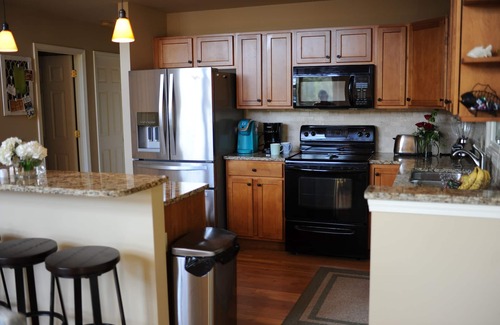 On the terrace level, the great room opens to the large lower deck. The 65" Smart TV in this room is perfect for watching your favorite team or sporting events on cable or Netflix, or for playing Xbox. Two large sofas and a futon add to your sleeping options. The kitchenette on the terrace level has a large refrigerator and dishwasher. The terrace bunk room has three single beds and a queen bed. It's perfect for sleeping 5. A third full bathroom and the laundry room are on this level.