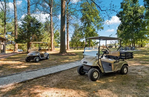 Step outside to a peaceful backyard oasis with a 12-person dining patio, gas grill, hot tub, and outdoor sauna for four. Follow the path to the firepit, perfect for s’mores under the stars. Two golf carts are available to explore the property’s trails, pond, and fields—great for a morning ride or sunset cruise.