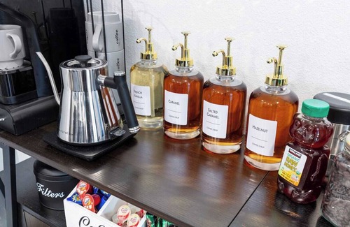 - Fully equipped kitchen with stainless steel appliances, cookware, utensils, and a coffee bar
