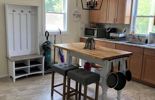 *the butcher block breakfast bar and kitchen island are NOT to be used as cutting boards. Cutting boards are provided in the lower cabinets in the kitchen. The blocks are poly coated and will resist stains/damage but please do be careful.