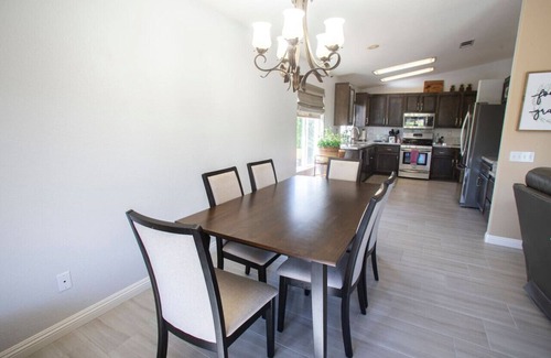 Stunning and one of a kind desert retreat, has everything you`ll need and more!You`ll feel completely rejuvinated during your stay, with refreshing swims in the heated pool or jacuzzi and relishing in the gorgeous golf course views. Soak up some sun and lounge out by the pool, BBQ and host an intimate dinner. Wake up and take advantage of the warm sunrises from the outdoor table with a delicious cup of coffee. Modern kitchen has warm, dark brown wood cabinetry, exquisite quartz counter tops and stainless steel appliances. An ideal kitchen for making home made meals, comes fully stocked, gas stove, spacious and plenty of counter-space. Cozy up in the living room on the reclining sofa and binge watch Netflix with some popcorn! Just finished your favorite show? We have you covered with a game night in with all the friendly family board games. Near the entry way, you`ll notice theres a bar, for you to enjoy some glasses of wine or to make some fun mixed drinks. Stylish, spacious and cozy Master bedroom has an en-suite bathroom, Smart TV, and sliding glass door leading you out into the backyard. The second bedroom has a cozy and trendy vibe with a closet and bunk beds for additional sleeping space. Both of the full bathrooms are up to date, with dual mirrors, double sinks, granite counter tops and a contemporary stand alone shower. You will not regretting choosing this desert oasis for your getaway!