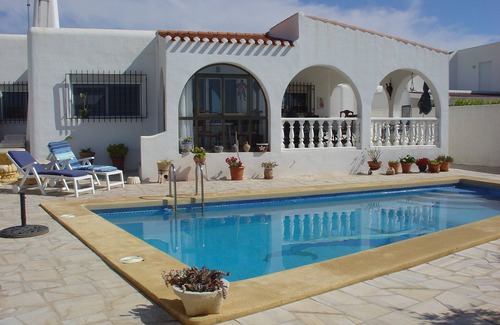 Beautiful detached villa on one floor only 300 mts away from the beach and within easy walking distance of local shops, bars and restaurants. With 8x4 mts private pool and stunning sea and mountain views from covered terrace and pool area. Very private and walled plot.