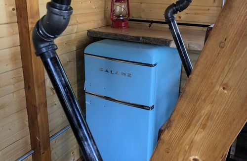 Boho Bungalow is a stand-alone 10'x10' bunkie with a spacious loft, retro mini-fridge, dining table, queen bed in the loft and a double futon on the main floor.