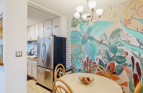This retreat is all about privacy - its prime corner location allows guests to enjoy a secluded spot away from all the hustle and bustle. Additionally, you will be within walking distance of coffee shops, a variety of restaurants, ice cream, and local shops. Inside, central AC and cooling tile floor offers respite from the heat and an inviting, open layout to unwind after a day of sun and fun. Kick back on the living room sofa while streaming your favorite shows and movies on the wall-mounted smart TV. A beautiful, custom cactus flower mural adorns the four-seater dining nook and the kitchen features everything needed for planning at-home meals. In-home essentials include free WiFi and shared laundry facilities can be found on-site.