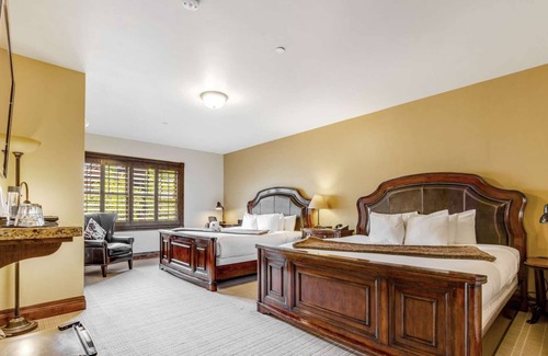 These well appointed 450 sq. ft. rooms have comfortable warmth, and feature leather and wood furnishings. Two spacious king beds are appointed with the fine linens, comforter, and pillows. An oval bathtub for soaking makes these rooms supremely relaxing.