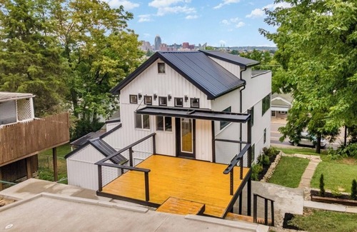 The Historic SouthGate House is a private oasis in the heart of the city. Just over a mile to Bengals and Reds stadiums, this modern 3 bedroom cliff dweller offers breathtaking panoramic views of Cincinnati. The private yard with a skyline view fire pit and huge rooftop deck with a wet bar is perfect for relaxing or catching a game on the outdoor big screen TV. Enjoy your morning coffee at the fireplace by the wrap around windows and watch as the city awakens at this ideal VRBO retreat.