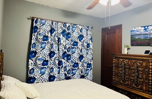 The family-friendly home features 3 bedrooms and one bathroom, a living room, dining room, and a fully fenced yard with a climber, swing set, saucer swing, and sandbox. The recently updated bathroom has a deep soaker tub & shower w/Kohler fixtures, which makes for a wonderfully relaxing bath experience over a regular tub; enjoy our bath tray for extra luxury! It can hold your soaps, lotions, & potions, a candle, a book or tablet, wine glass/coffee cup/other beverage, or whatever you desire when enjoying a long soak! Our dining area is small but mighty; we have the leaf in the antique table in order to extend it for seating for 6 guests. There are 3 bedrooms, queen on the main floor and a full upstairs along with two twin beds in the last room. Living room features free WiFi, xbox, huge smart TV (feel free to use our Netflix, Disney+, &/or Prime TV - or login to yours), electric fireplace, a loveseat and two cushy chairs. Plus some plants and side tables!