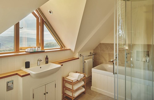 There are two beautiful bedrooms, each complete with calming colour tones, country-style décor and stunning views. The first bedroom is on the ground floor and features a super-king-size bed (it can be converted into two singles if required) and the master bedroom is on the first floor with a super-king-size bed.