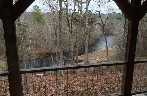 The Eagles' Nest Getaway is a private riverfront retreat nestled in the scenic hills of Southwestern Arkansas along the banks of the Little Missouri River. It sleeps 10 people and has two and a half baths. Great Trout Fishing. The cabin is located a few miles from historic Murfreesboro, Arkansas, Crater of Diamonds State Park and Lake Greeson. This cabin is owned and operated by the Old Factory Getaway owners and received its name for the incredible view and occasional bald eagle sightings.