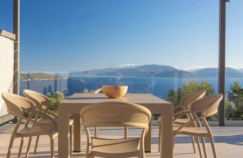 Villa Solar is tucked into verdant, olive-covered hills, offering sweeping views of the Ionian Sea, with Meganisi, Arkoudi, Atokos, Kefalonia, and Ithaca painting the distant horizon. This contemporary villa, perched gracefully on the hillside, blends modern sophistication with the tranquil beauty of its natural surroundings.