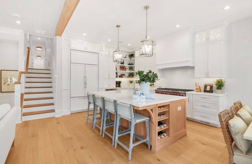 With six bedrooms and three full bathrooms, there’s space for everyone—whether it’s a sprawling family gathering or friends sharing a summer escape. The primary suite feels like a private spa, with a custom tile shower, double vanities, and serene design.