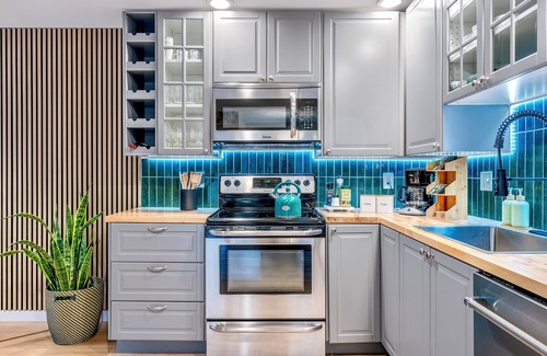 Enjoy a fully stocked kitchen equipped with everything you need for home-cooked meals, plus a convenient washer and dryer for longer stays.