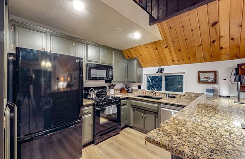 Inside, feel right at home in the cozy, open-concept living area featuring high wooden ceilings, tasteful decor, and wall-to-wall windows bathing the space in natural light. Snuggle up by the wood-burning fireplace for family movie night or play pool and darts while sharing lots of laughs with friends! A stylish full kitchen welcomes you to whip up a delicious home-cooked meal, then retreat to the wraparound deck for a sunset cocktail. The breathtaking views and crisp mountain air will inspire lifelong vacation memories.