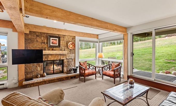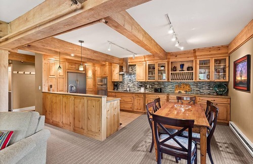 This charming, slope-side condo features an open floor plan that conveniently combines the kitchen, living room, and dining area. The kitchen comes fully equipped with modern stainless steel appliances, utensils, gorgeous granite countertops, and plenty of space. The dining table accommodates six people. The main living area offers beautiful mountain views, a wood-burning fireplace, and flat-screen TV. Guests will also enjoy the mountain side outdoor patio equipped with a gas grill.