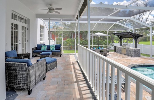 From this outdoor haven, you can take in the view of the sparkling screened-in heated pool with TV ,plenty of seats and pool toys for the family to enjoy ,