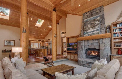 Alpine Haven is a custom-built home showcasing striking character and fine attention to detail. From handcrafted stonework and stunning fixtures to granite countertops and hardwood floors, the beautiful touches of this lodge-style vacation rental invite you to embrace mountain living. The floor-to-ceiling stone fireplace and dramatic views of Thunder Ridge immediately welcome you to your Tahoe vacation.