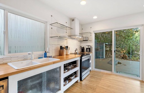 The stunning Sedona Canyon Whisper is located in the desirable Oak Creek Canyon community and offers a light, open, and “viewtiful” retreat. This contemporary gem features three bedrooms, two full bathrooms, and one half bath. Just four miles north of Sedona, you'll be among the mountains and creeks of Oak Creek Canyon. The home borders the Coconino National Forest with three peaceful trails ready to explore. Built with non-toxic construction, the home features views from every window and a balcony deck off every bedroom. All three bedrooms are upstairs. This irreplaceable setting offers a serene private hideaway in the forest and canyon. Just down the hill are two spring-fed creeks, perfect for strolling among wildlife, fish, flora, and fauna. The Eurostyle kitchen is clean and simple, completing this relaxing and natural retreat.