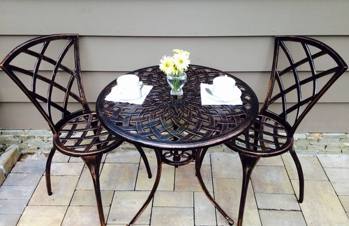The kitchenette has a microwave, Keurig, mini fridge, sink, dish ware and utensils. There is a large outdoor area with a grill for your use as well.