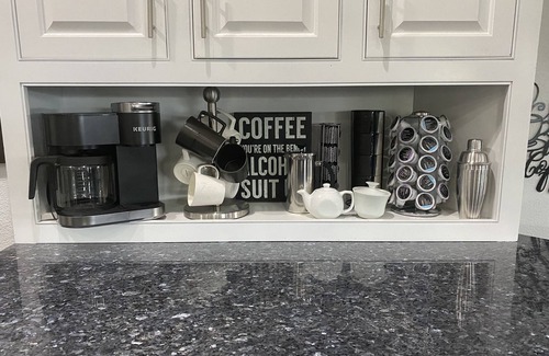 Downstairs also has its own kitchenette, including a microwave, sink, Keurig k-cafe, and a fridge. It also has its own door to the outside and its own personal driveway for easy access.