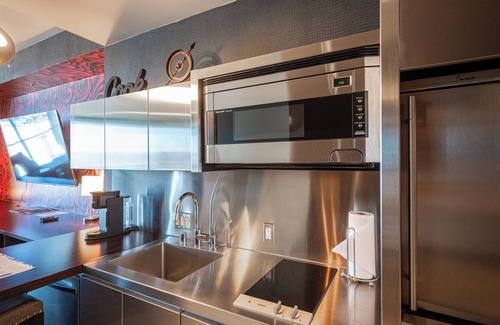 The suite boasts a king-size bed and a unique 70-inch SMART TV with complimentary Netflix—the only one available on the property. Accommodate additional guests with a comfortable queen sofa bed. The kitchen is equipped with a mini fridge, microwave, stove, and cookware for your convenience.