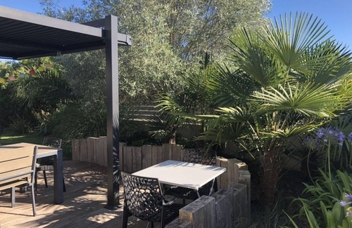 Wooden terrace in a Mediterranean garden