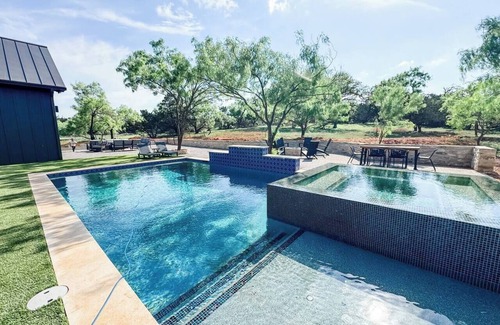 Experience the ultimate Hill Country Retreat at this expansive 7-bedroom, 5.5-bath estate nestled on 120 scenic acres. Enjoy luxurious amenities including a pool, hot tub, infrared sauna, and a master suite with a fireplace and cast iron tub. Surrounded by longhorns and Nigerian Dwarf goats, this property offers a unique blend of rustic charm and modern comfort, perfect for family gatherings, celebrations, or corporate retreats.