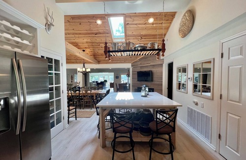 The design is clean, fresh and cheerful. Cathedral ceilings. Brand new white washed wooden floors through out for clean low allergen environment. Pretty china and glass cabinet full of wine glasses waiting for the vacation to start....