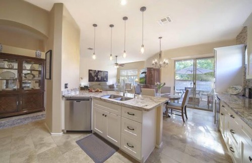 This stunningly remodeled upscale home..in a gated community awaits you! FULLY FURNISHED ! 3 Bedroom, 2 bath, split plan (3 separate hallways to the bedrooms and study... makes it ideal for larger groups to stay all in one house and still have some privacy). Greatroom concept. Travertine Stone floors/ showers and granite countertops thru-out. Carpet in the bedrooms. Hot tub, gazebo w/outdoor dining patio. Master bedroom suite offers king size bed w/ dual sinks, walk in shower and closet. Bedroom 2 is a queen and bedroom 3 has queen size bed w/hall bath nearby. Study/Den for your office and computer needs. 2 car garage. High speed WI-FI throughout home and 4 cable TV’s.