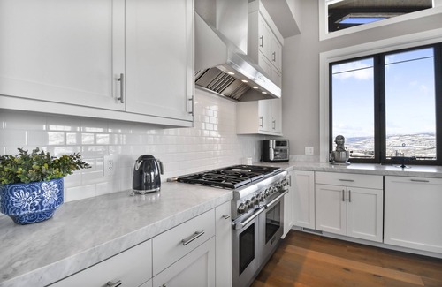 The kitchen is fully stocked with everything you need to cook your favorite meals. It also includes a Keurig coffee maker, a gorgeous stainless steel range, dual sinks, and stunning views from large windows.