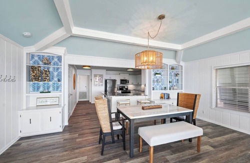 The living room is adjacent to the kitchen featuring comfortable furniture, large sliding glass doors, designer touches, and a large flat screen mounted TV and swinging chair to sit and enjoy the birds or read your favorite book. Next to the living and kitchen is a dining area that comfortably seats 6