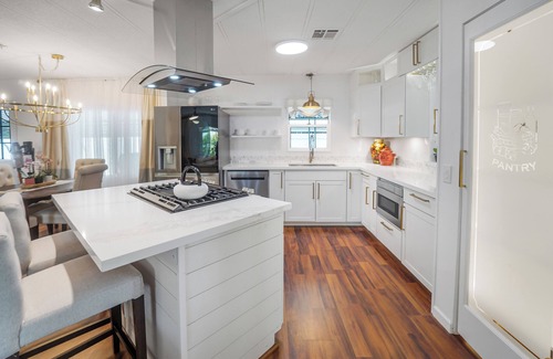 -Modern kitchen with quartz counters, gold fixtures + new appliances