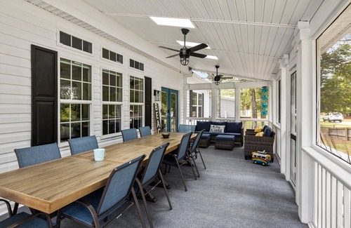 You will enter through the large screened-in porch, complete with an outdoor dining table that easily seats 10 people, and additional outdoor conversation seating for at least 5. You can enjoy meals and socialize under the skylights and three outdoor ceiling fans.