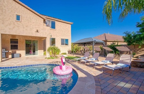 Relax with the whole family at this peaceful home. Enjoy the outdoors with a pool, jacuzzi, cornhole setup, firepit, BBQ, and dining area. Enjoy not one but two media seating areas. One has a fireplace and the other with a large movie projector and blackout curtains to maximize the best viewing. This home is in a tranquil suburban neighborhood with beautiful mountain views. Make this your home away from home in Phoenix.