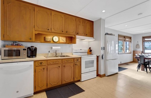 This updated 1950’s family retreat has four bedrooms, three baths, a cozy den with fireplace, and a cheerful sunroom with a pull-out sofa to comfortably accommodate 12 overnight guests. Prepare your meals in the fully equipped kitchen or on the outdoor Weber charcoal grill, and dine indoors at the handcrafted pine table that comfortably seats 10 or eat outdoors on the inviting screened-in porch or spacious deck.