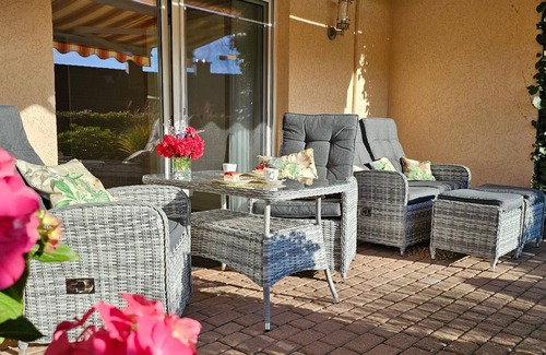 The outdoor area invites you to relax with its sheltered and partially covered west-facing terrace - surrounded by our lovingly tended garden and views of the hilly landscape. Enjoy the lush floral splendour in summer, snack on tomatoes, strawberries and herbs depending on the season or end the day with spectacular sunsets. An electric barbecue is available for outdoor culinary delights.