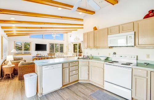 At this beach house you can choose from multiple decks to sip your morning coffee, watch the sunrise, practice some yoga, people watch, or read a book with the sound of the ocean in the distance. Sliding glass doors lead from the decks into the main living area. The open floor plans lead to a fully equipped kitchen well-appointed with full-size appliances and ample counter space, so that preparing meals can be enjoyed by all. The dining area features ample seating, and more bar seats are at the kitchen counter. A rustic screened breezeway, just off the dining area, features a picnic table, offering a sunny breakfast nook or overflow seating for group meals. This breezeway acts as a mudroom and a great place to hang towels and leave sandy flip-flops and beach bags. The primary bedroom is connected through a side room off the kitchen then through double doors and features an attached bathroom. A second door accesses the breezeway. Across the breezeway are two more bedrooms (each bedroom sleeps three) which share a bathroom.
