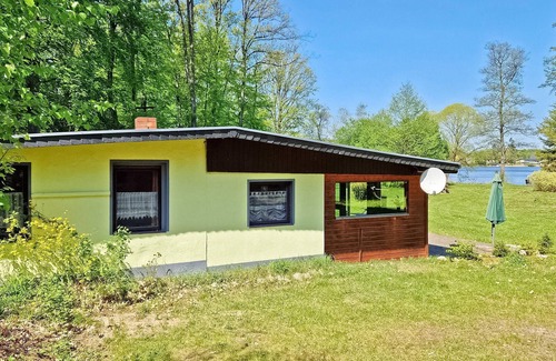 This holiday home is located in a small holiday complex with 2 other holiday homes and is situated directly on the Schlabornsee, in a quiet location on the edge of the forest, on a 3,500 m² separate lake property. A restaurant is approx. 1 km away, a bakery and shopping facilities are approx. 2 km away. The 3 houses are in close proximity to each other. This holiday home is approx. 60 m² in size, equipped with electric heating for up to 4 people and has a large, furnished veranda/winter garden (leather couch, dining table) with lake view, a living area (couch, wood-burning stove, flat-screen TV) with open kitchen (dining table, electric hotplates, fridge, toaster, kettle, coffee machine), a bedroom (1 double bed, 1 bunk bed), a bathroom (shower, WC) and a terrace with lake view.