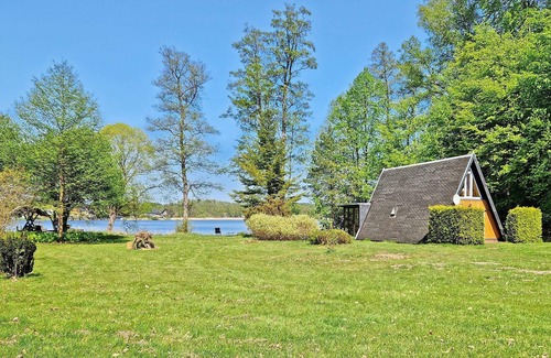 This holiday home is located in a small holiday complex with 2 other holiday homes and is situated directly on the Schlabornsee, in a quiet location on the edge of the forest, on a 3,500 m² separate lake property. A restaurant is approx. 1 km away, a bakery and shopping facilities are approx. 2 km away. The 3 houses are in close proximity to each other. This holiday home is approx. 65 sqm large, equipped with electric heating Finnhütte for up to 5 people has on the ground floor a conservatory with lake view (dining table, couch), another living room on the opposite side (sofa bed, flat screen TV), a kitchen (passage room, dining table, electric hotplates, refrigerator, various small kitchen appliances) and a bathroom (shower, toilet). In the upper area (via a STEEP staircase!) there is 1 double bed and 2 single beds opposite.
