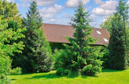Idyllically situated on the edge of the forest in Linow, the holiday apartment for up to 2 adults and 1 child is located on a 4,000 square metre residential and natural property with a villa (the owners' home) and an old flour mill in an outbuilding. The long-distance cycle path E10, which connects the neighbouring villages, runs directly past the property. The open-plan gallery flat is located on the upper floor of the residential outbuilding, which was extended in 2010, and can be reached via a separate entrance via an external staircase. It is equipped with a living and sleeping area (upholstered furniture, double bed, sofa bed, TV, radio, fireplace), a kitchen and dining area (kitchenette with electric cooker, fridge with freezer compartment, dining table, various kitchen appliances), a bathroom (shower, WC) and is centrally heated. Due to the sloping roof, the apartment is only partially suitable for people over 1.95 metres. The grounds include a beautiful natural garden with many niches, seating areas, deckchairs, a garden pond, a campfire site, a greenhouse and a paddock. The owner offers seminars and workshops on forest bathing, wild herbs and healthy eating. (Current course offers and booking on site.) The hosts' philosophy is: Arrive, relax, enjoy. For this reason WLAN is not available. The total price includes final cleaning, bed linen, towels, water and energy. Pets: One small dog up to a size of 40 cm is allowed.