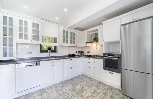 Mutfak : Modern Amerikan mutfakta buzdolabı, çamaşır makinası, bulaşık makinası, fırın, ankastre 4'lü ocak, elektrikli su ısıtıcısı, yemek takımı, çaydanlık, çatal bıçak seti, tavalar, tencereler, bardaklar bulunmaktadır.