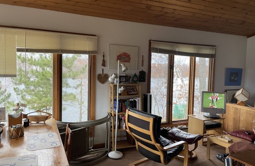 50 acre lakefront pristine isolated acres with great fishing, and you’re the ONLY hunters! Great bass &I pike fishing! Trails and tall trees with eagles, deer and critters. Fishing is great-catch big pike and bass; sport shops 5 miles away. We prefer no pets; write to ask because we have made exceptions and have had dogs. Fire pit, modern kitchen, beds + pull out couch; bathtub, private bath, and more! You will get away from it all and watch nice sunsets while the waves and loons lull you to sleep. Hear the loons call in the pine forest with a crystal clear lake; rowboat, 1/8 mile driveway. 50 acres of forest! We sleep two couples in each of 2 bedrooms, there is a fold out double bed in living room, and there are 2 futons in the cool basement common area/rec room. Kids LOVE it!