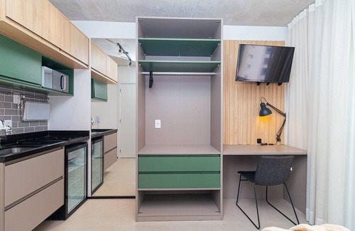 The studio space was fully optimized and lit in the best way, it has a modern and clean touch. It has a television, wifi, induction stove, kitchen utensils, microwave, air conditioning, bed and full-length mirror that adds spaciousness to the apartment.