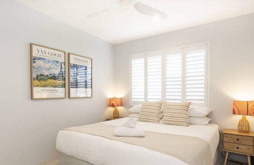 With beach-friendly ash-blond flooring throughout, the apartment’s open-plan living/dining/kitchen space features absolutely stunning views of Freshwater beach. There’s a comfy L-shaped lounge suite, an occasional chair, a Hisense wall-mounted smart TV, a dining table for 6 people and plantation shutters. The kitchen comes with stone bench tops, including an island with loads of space for food prep, a family-sized fridge/freezer, a Dishlex dishwasher, 4-burner induction cooktop, under-bench electric oven and a microwave. Glass sliding doors take you out on to a balcony with a spectacular 180 degree view of the beach in one direction and Freshwater in the other. Outdoor chairs are there for you to enjoy your morning coffee.