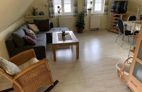 Cozy, newly furnished apartment with a size of about 50 square meters for 2 people in the upper floor of the Friesenhauses Lüch Op. Living room with flat-screen satellite TV, large seating area, rocking chair, dining table and fully equipped kitchenette with oven and ceramic hob. Bedroom with double bed.