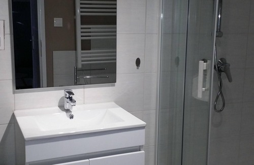 - 1 bathroom with corner shower, 1 cabinet including sink and storage, 1 mirror with lighting, 1 storage shelf, 1 electric towel dryer, 1 hair dryer 1 laundry basket - separate WC.